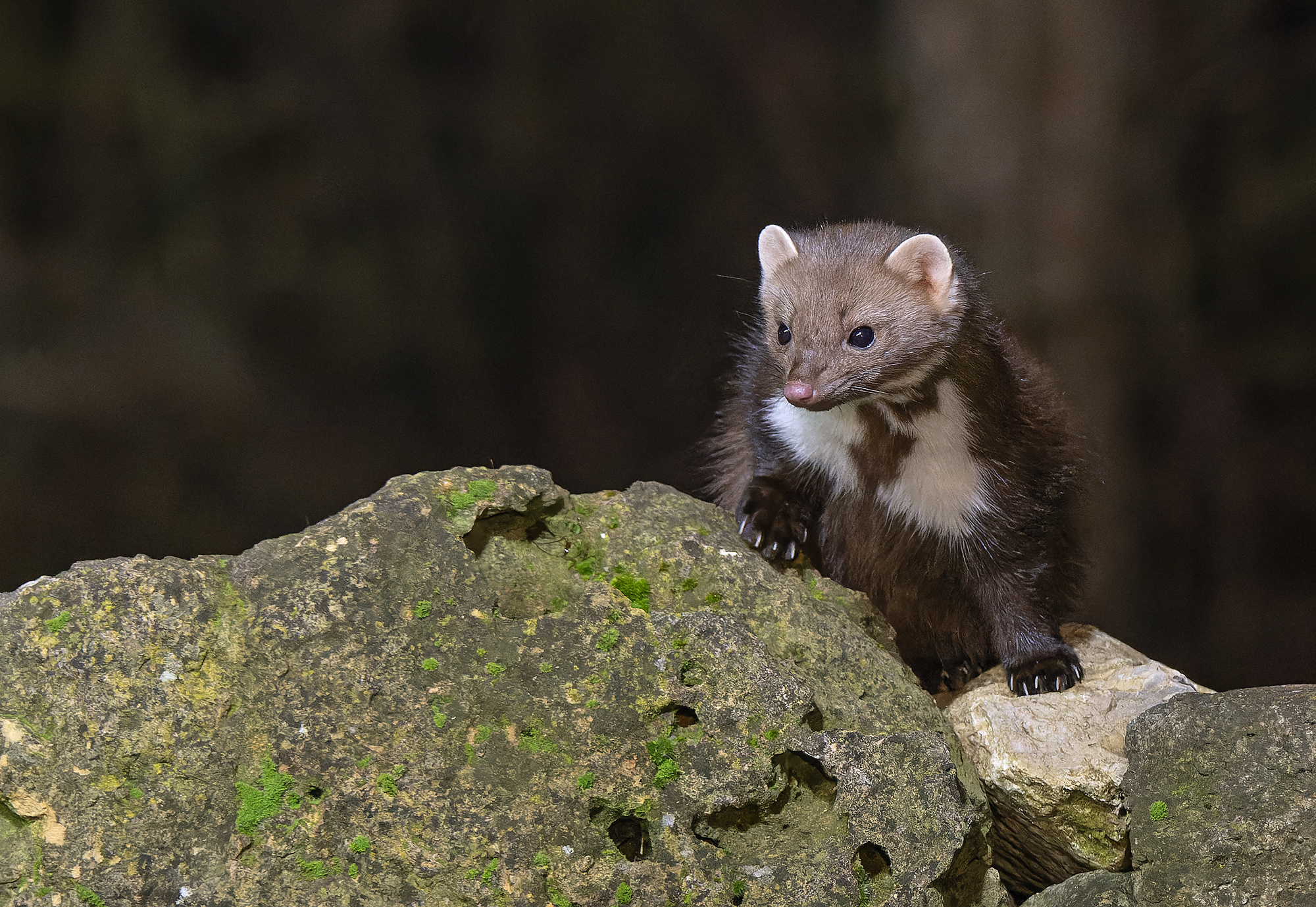 The weasel’s pose is natural, and the lighting highlights its fur and expression well. The mossy rock adds texture without distracting from the subject.