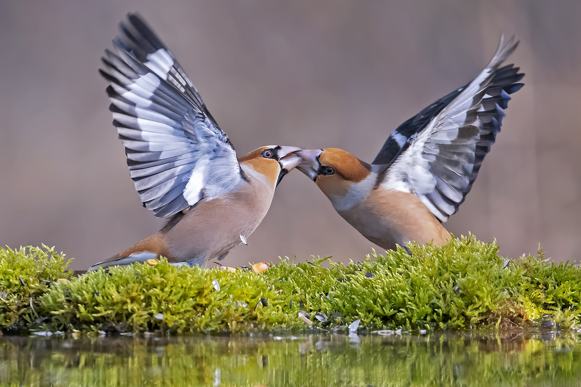 На снимке запечатлён живой момент: два снегиря, раскрыв крылья, сближаются над густым мхом у кромки водоёма. Отражение в воде усиливает визуальную глубину кадра. Фотография передаёт естественное поведение птиц в дикой природе — возможно, это элемент социального взаимодействия или брачный ритуал. Композиция выстроена с акцентом на движение и симметрию, подчёркивая красоту и динамику природного мира. Фотограф: Sergey Zlatkov.