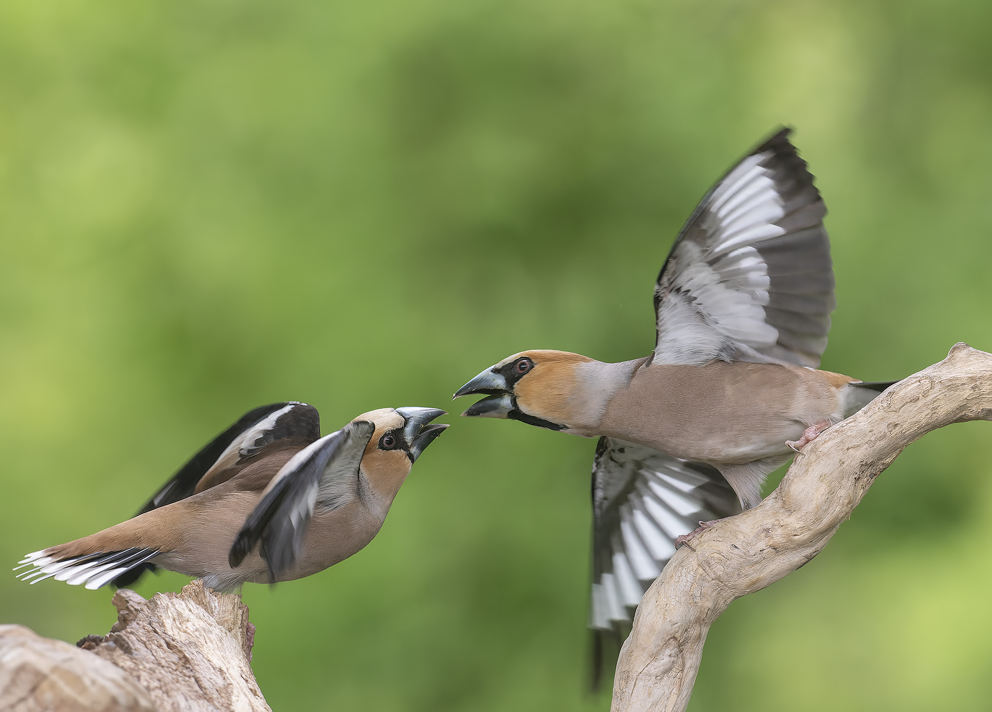 Two hawfinches in motion, wings spread, beaks open — a moment of interaction, alive and natural. The soft green blur behind keeps focus on the birds, their earthy tones and sharp wing patterns standing out. Simple, clear, and quietly engaging. 🐦🌿