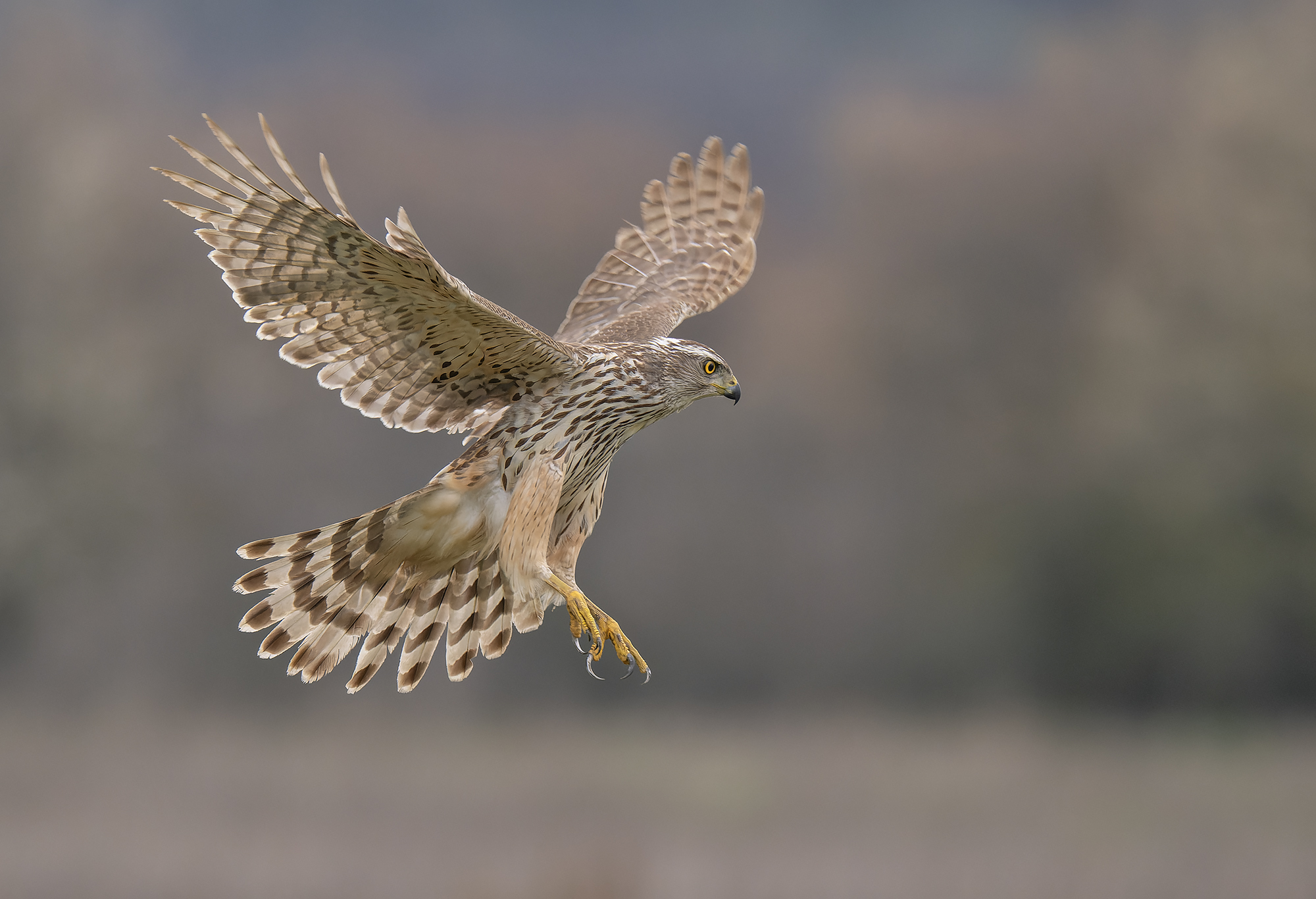 На снимке запечатлен сокол в момент активного полёта над открытой местностью. Птица демонстрирует мощь и точность движений — расправленные крылья, острые когти и сосредоточенный взгляд. Фотография передаёт динамику и естественную среду обитания хищника. Работа Сергея Златкова.