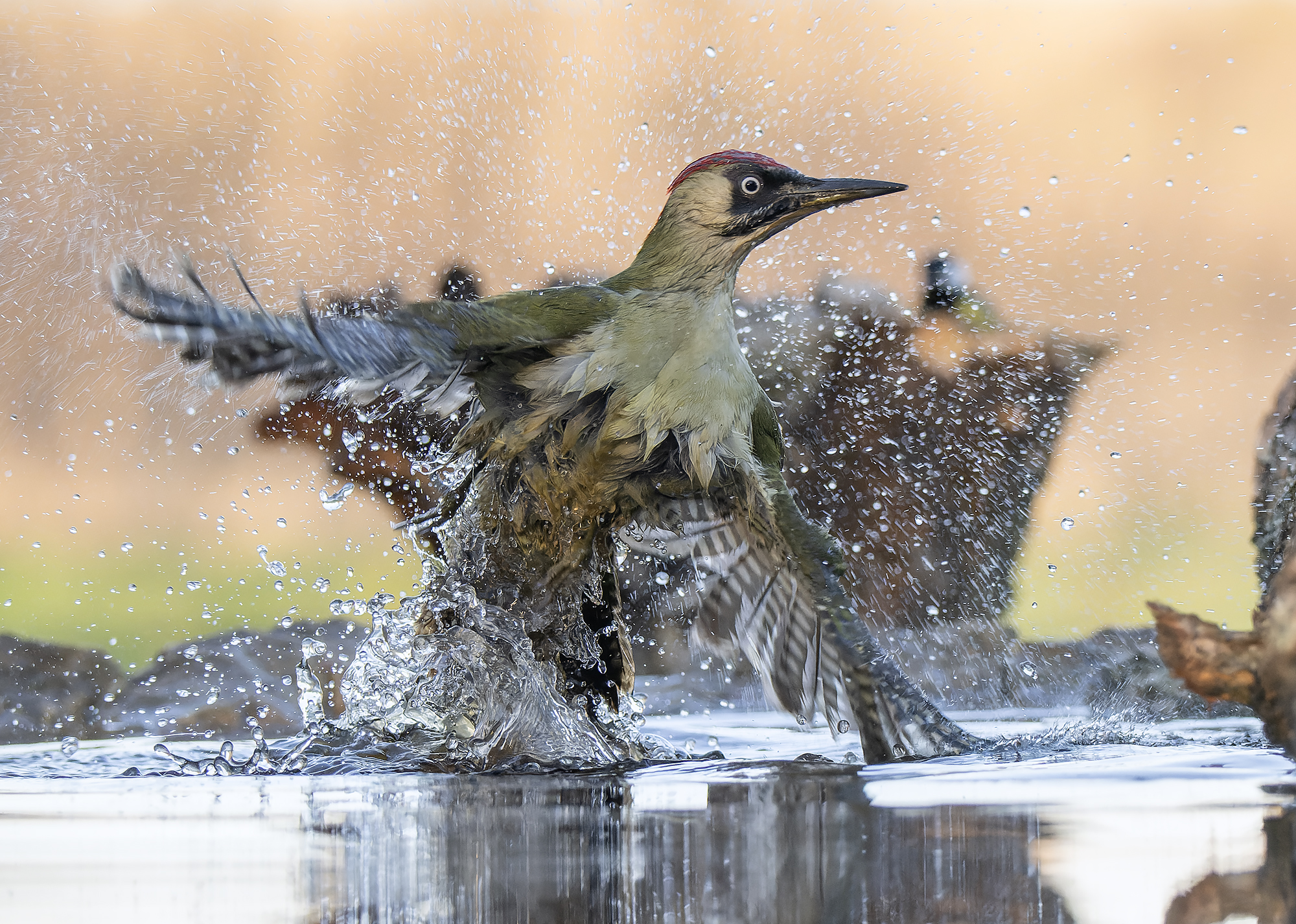 Зелёный дятел, застывший в момент купания, разбрызгивает воду, раскрыв крылья. Фотография передаёт динамику и естественность поведения птицы в природе. Отражение в воде и размытый фон подчёркивают фокус на действии. Снимок демонстрирует необычную сторону жизни дятлов — гигиенические процедуры в естественной среде. Фотограф: Sergey Zlatkov.