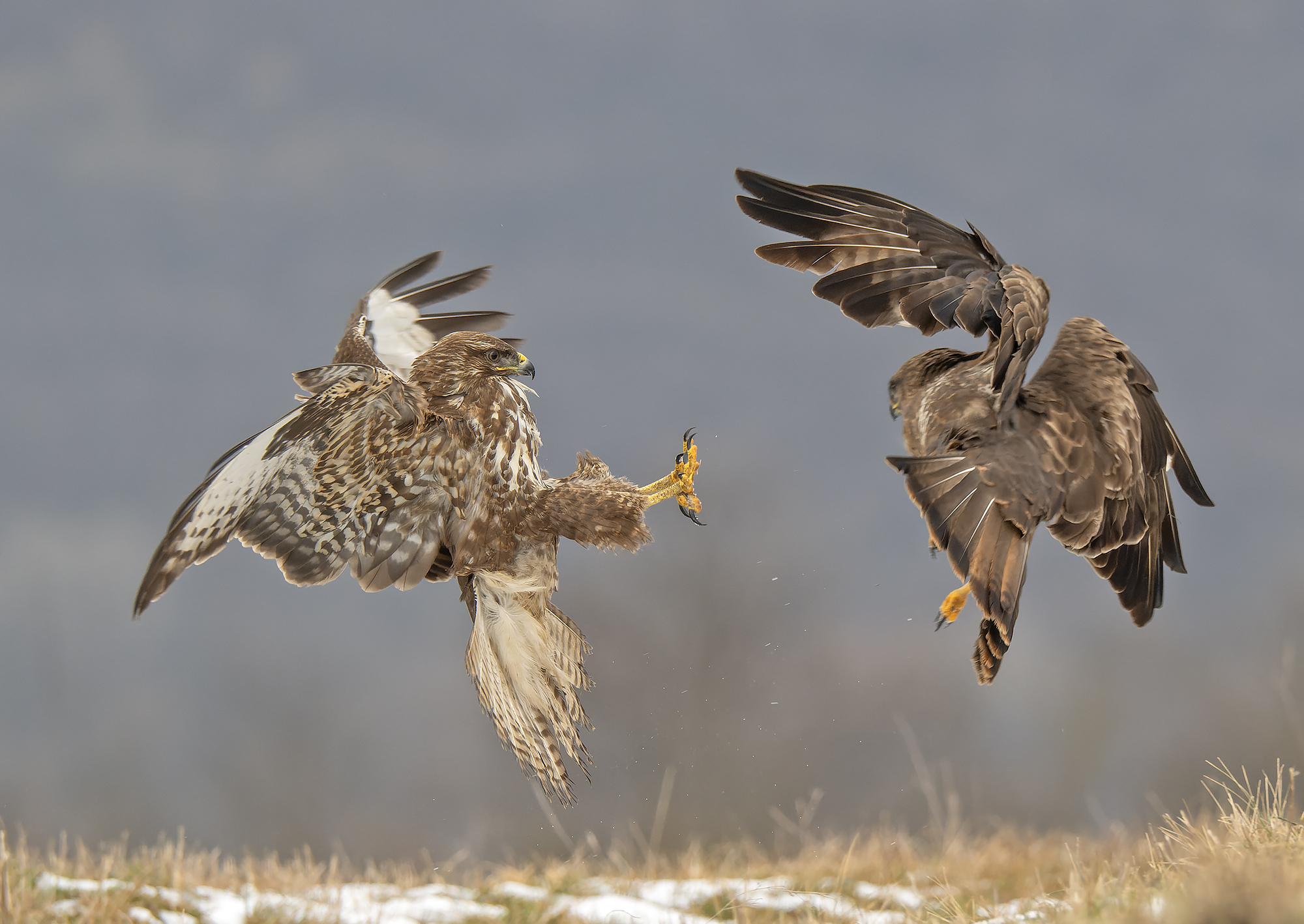 На фоне размытого пейзажа два крупных орла вовлечены в интенсивную схватку в воздухе. Их мощные крылья и острые когти свидетельствуют о серьезности конфликта, вероятно связанного с борьбой за территорию или статус в стае. Этот редкий кадр запечатлен фотографом Сергеем Златковым, демонстрируя не только силу, но и сложную социальную динамику среди хищных птиц в естественной среде обитания. Сцена передает всю драматизм дикой природы, где выживание часто зависит от силы и решительности.