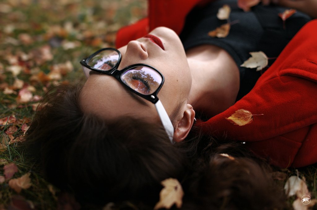 девушка, листья, трава, желтый, красный, яркий, помада, очки, Роман Золотой