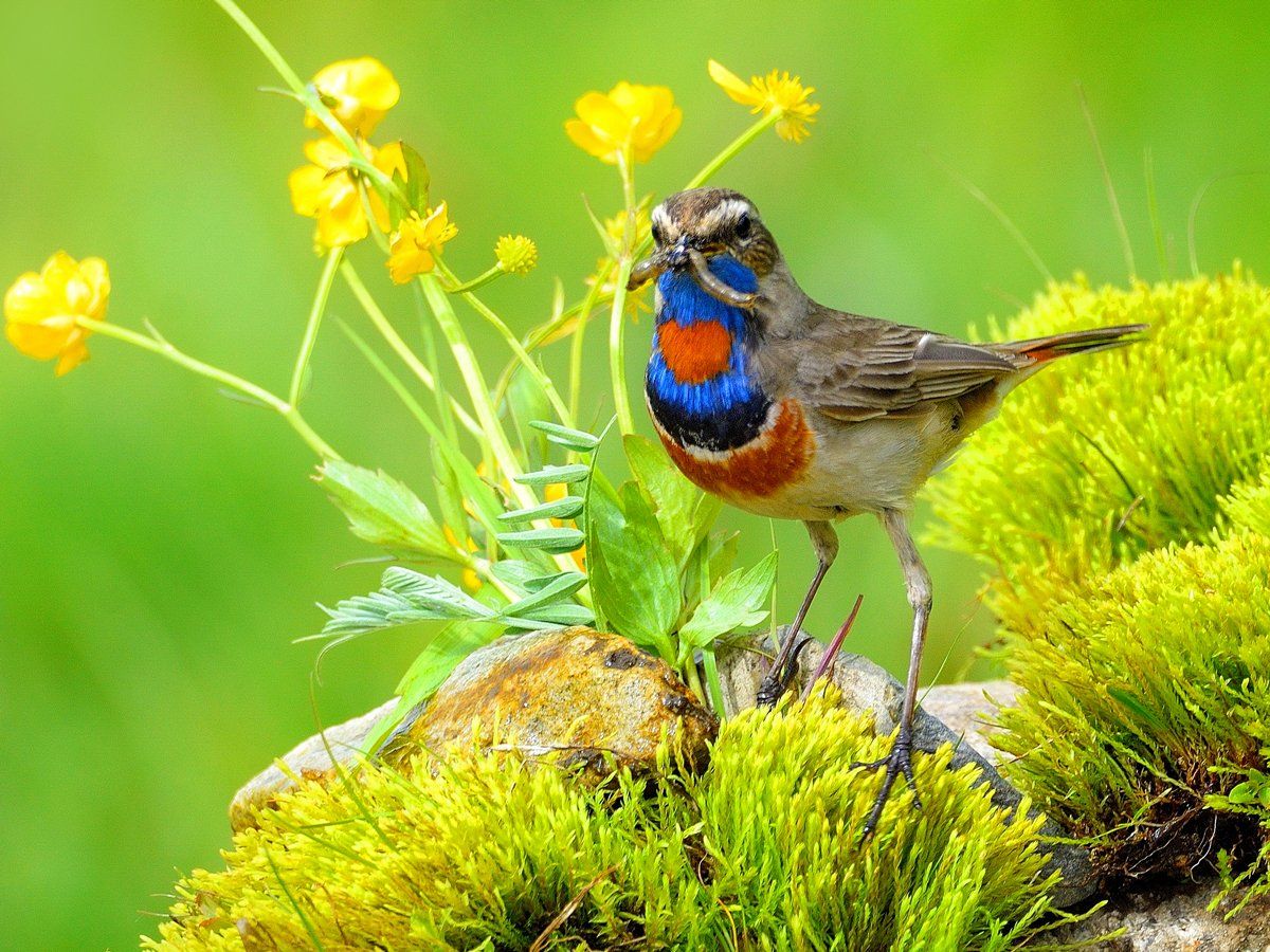 Варакушка. Роль луговых птиц состоит в том, что они уничтожают вредителей и разносят семена различных растений. Птицы, которые живут на лугу, имеют длинные ноги относительно тела. Благодаря этому они спокойно могут передвигаться по высокой траве.