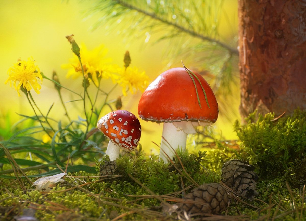 Мухомор красный. Знаком всем по яркой окраске. Этот гриб порой выглядит очень эффектно, красиво и привлекательно. По ней располагаются белые хлопья – это сохранившиеся сегменты тканей в процессе формирования роста. Красный мухомор встречается во всех лесах с июля до поздней осени. Гриб очень красив, но коварно ядовит.