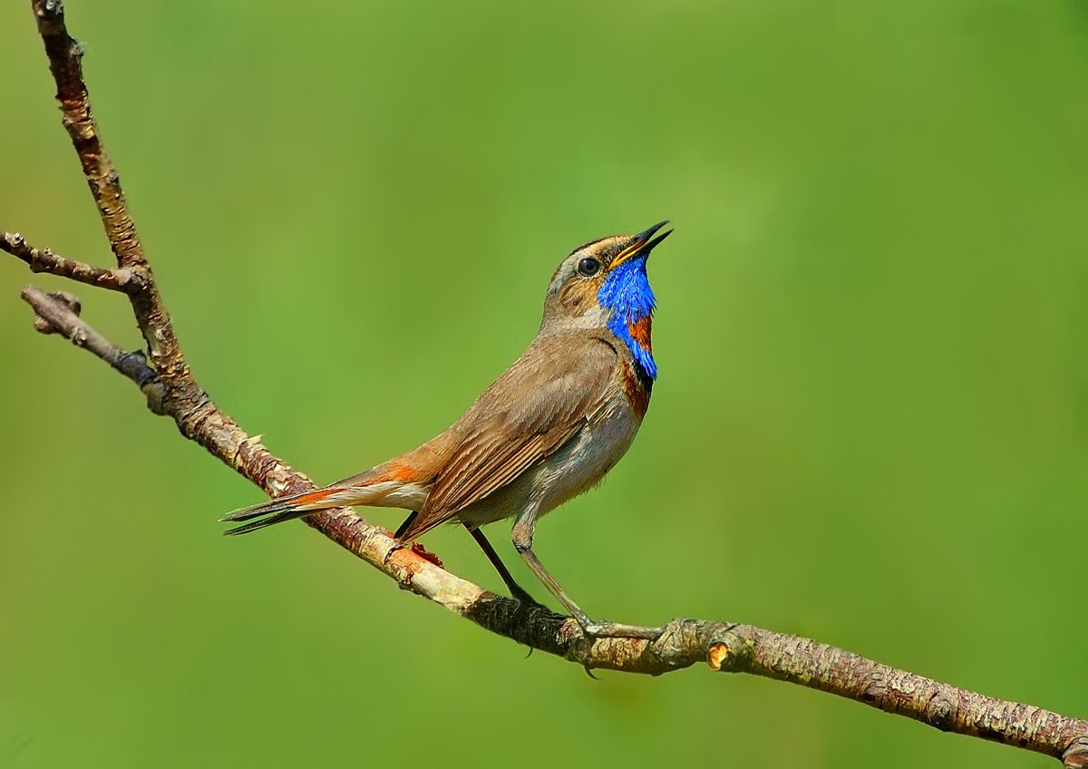 Варакушка. Все знают, что лучший певец у нас — это соловей. Все об этом слышали, хотя большинство людей соловьев не видели ни разу. Так вот, варакушка — это ближайший родственник соловья. И размером она такая же, и повадками, и поет она ничуть не хуже соловья. Песня взрослой и хорошей варакушки много разнообразней, чем у соловья, звучна, ее можно слушать бесконечно долго, и она никогда не будет надоедать. Когда она бегает по траве, не перестает петь. Варакушка — это единственная птица, в оперении самца которой имеется редкий в природе синий цвет.