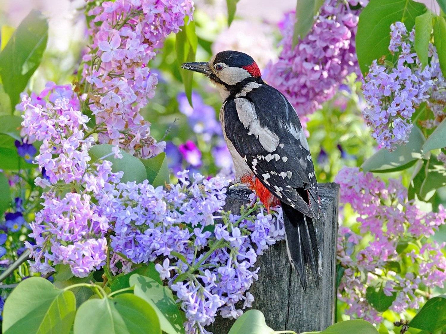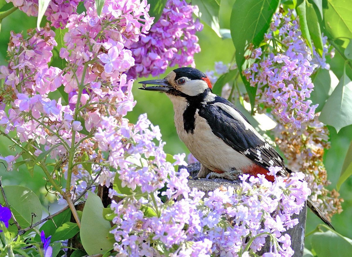 Пестрый дятел. Охотно селится в парках и лесопарках с изобилием старых деревьев, Дятлы не очень-то боятся людей, поэтому нередко селятся на садовых участках. Пёстрые дятлы являются настоящими защитниками сада. Они быстро и эффективно освобождают насадки от различных видов вредителей. Особое лакомство для дятлов представляют муравьи, в изобилии водящиеся в садах. За один обед птичка может съесть их до 800-1000 штук