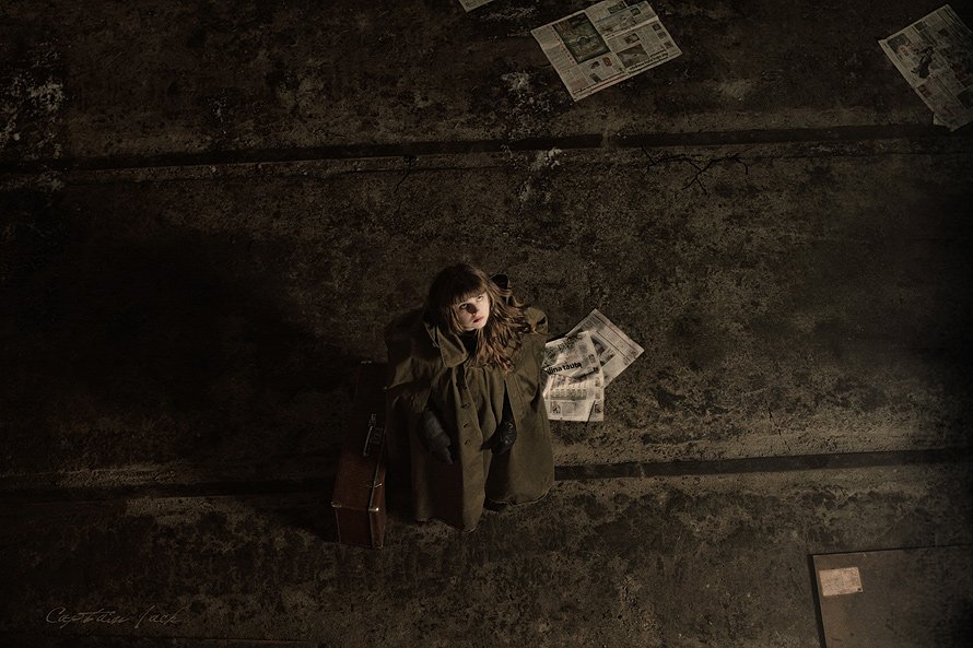 сейчас я еще один "бессонный" вопрос задам: сходство с шинелью мне мерещится? интересное сочетание современного макияжа, многоцветной печати газет и старого чемодана... а мне нравится!