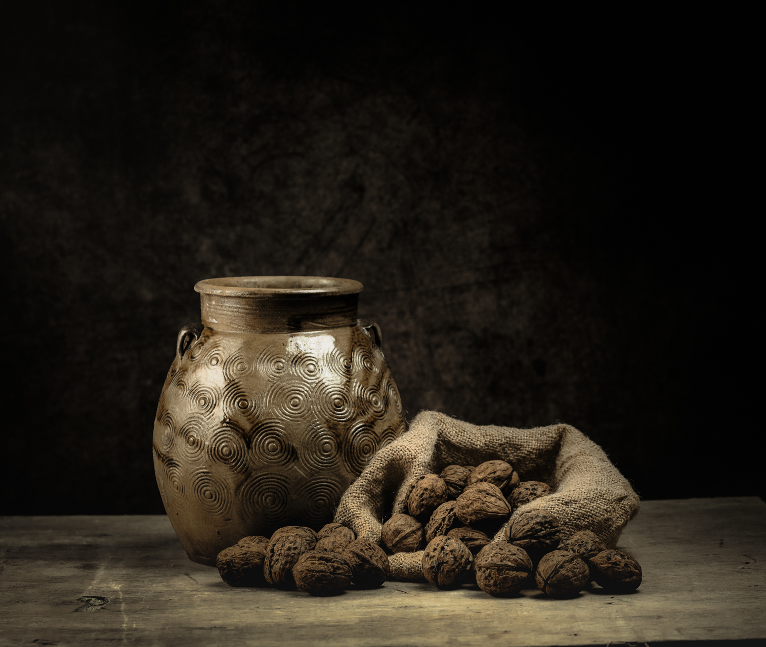 Работа понравилась. У Вас есть этот же горшочек в другой работе. Там блик выполнен очень хорошо. Если бы его переместить на эту работу, было бы здорово. Здесь, мне кажется блик персвечен. Хотелось бы помягче для гармонии со светом на орехах.
