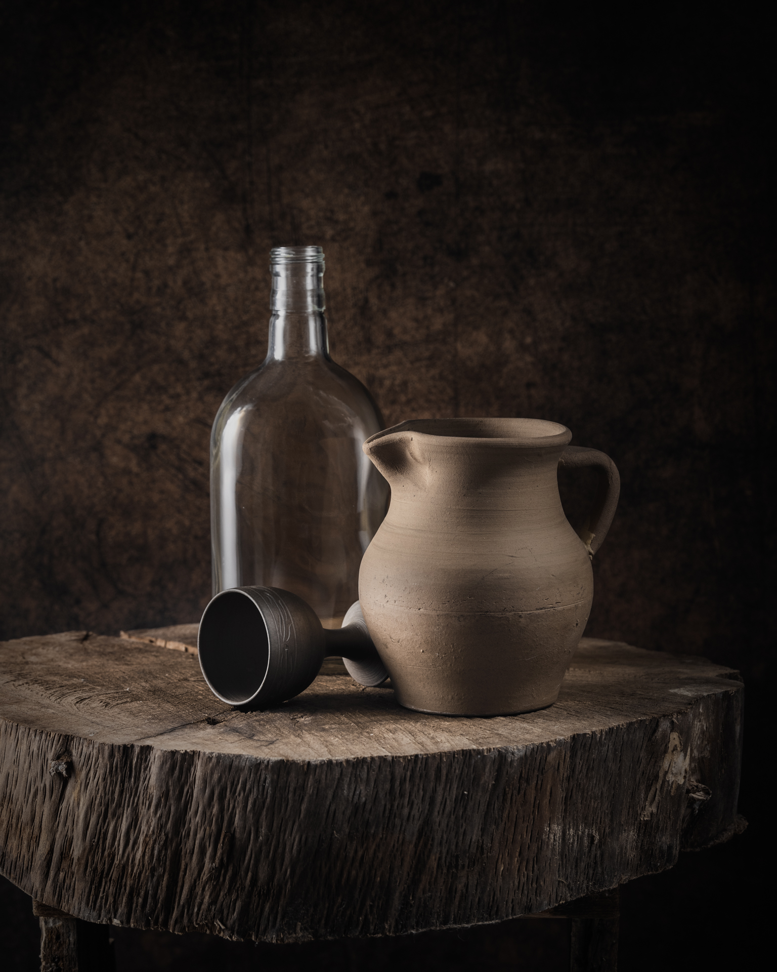 Simple, grounded still life — earthy textures, quiet light, and a sense of time. The glass bottle, clay pitcher, and metal cup rest naturally on the wood, each form honest and unadorned. A calm, thoughtful composition. 🍃