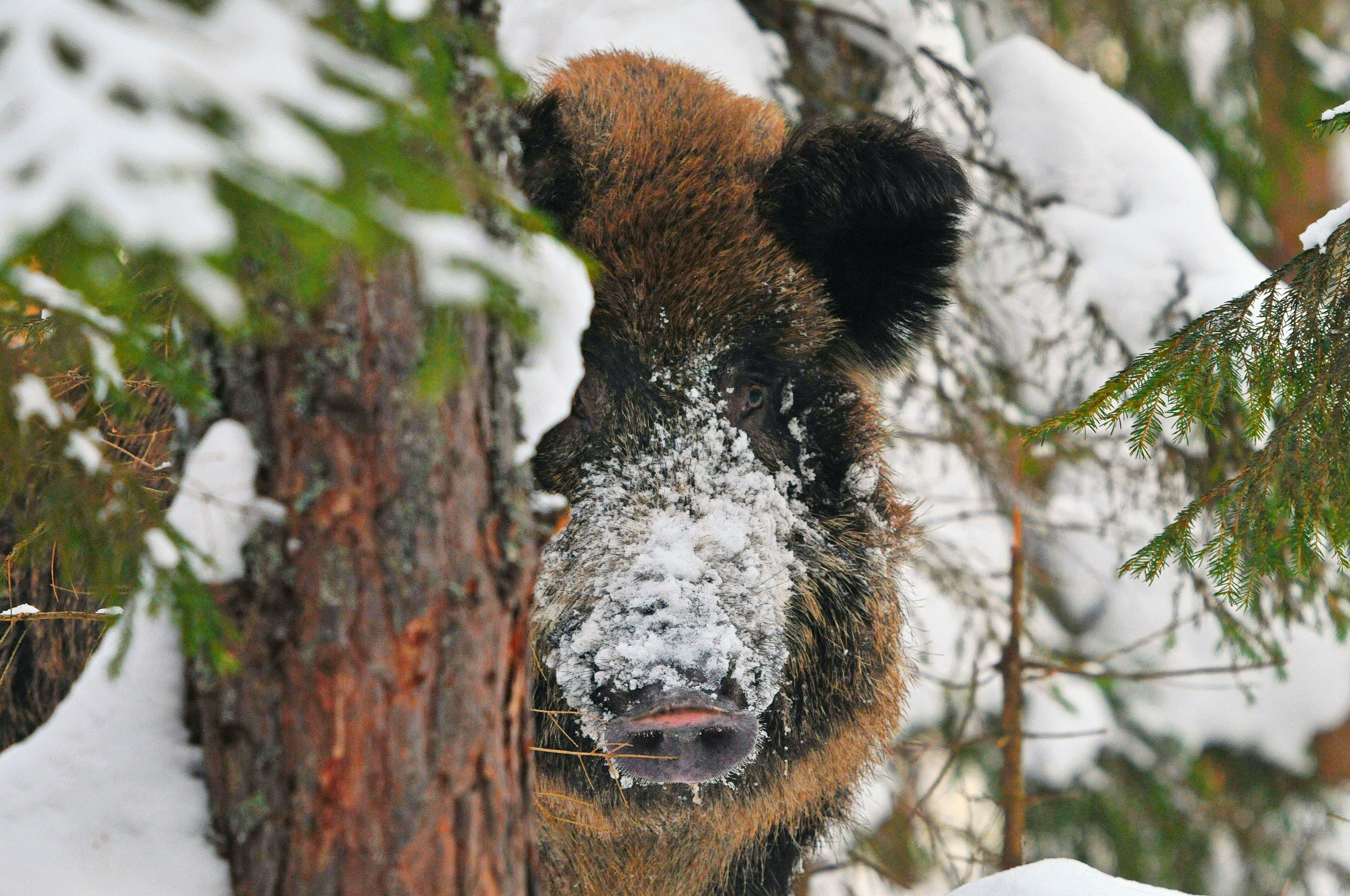 Я знал, что кабаны пройдут по этой тропе, к месту подкормки, и расположился рядом с ней, в глубоком снегу. Ждал достаточно долго и, несмотря на теплую одежду, холод начал пробирать. Но произошедшее дальше заставило меня забыть о холоде. Стадо двигалось быстро и уверенно. Впереди шла самка. Появившись из-за дерева и увидев меня, она замерла как вкопанная. Её взгляд был пронзительным и изучающим меня. В эту минуту я ощутил всю силу и мощь, заложенную в этом животном. Только встретившись с диким животным в его родной стихии можно испытать такие эмоции. "Я здесь только с добрыми намерениями" - пронеслась у меня в голове мысль. Самка не спеша прошла передо мной, не обращая на странного человека в сугробе никакого внимания, а за ней проскакали еще полосатые поросята. Я успел сделать несколько кадров.